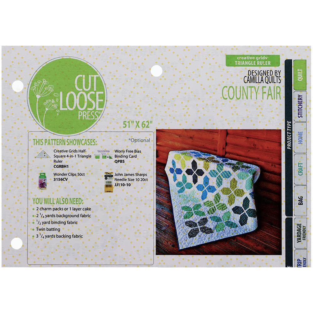 Bring home the blue ribbon with the Cut Loose Press County Fair Quilt Pattern designed by Camilla Quilts! This pattern only requires minimal skill and patience but yields classic, quality results. Get more comfortable with larger projects without all of the intricate piecings as this pattern consists mainly of large blocks and backing. Use the Creative Grids Half-Square 4-in-1 Triangle Ruler for faster cutting (not included).