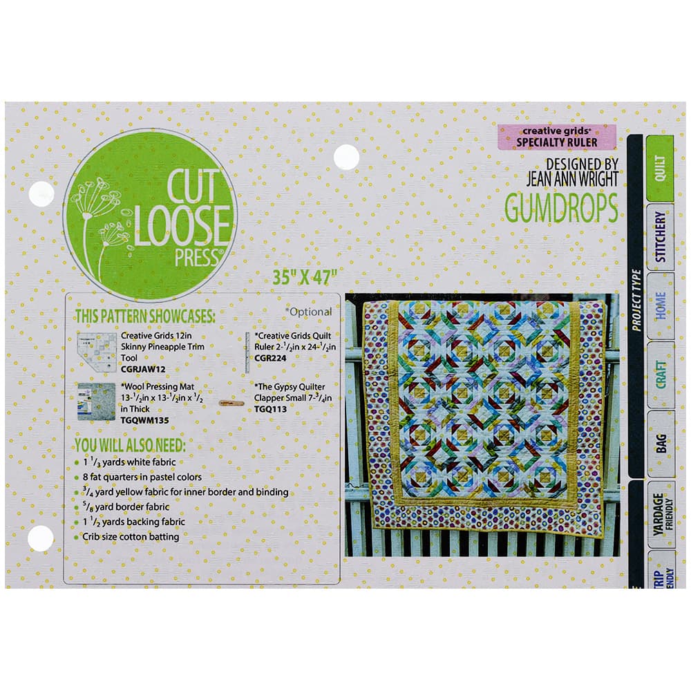 The Gumdrops Quilt Pattern from Jean Ann Wright is a fun weekend project. It is both fat quarter and yard friendly. To complete this 35" by 47" pattern you will need Creative Grids Skinny Pineapple Trim Tool and the 2-1/2" x 24-1/2" Ruler (sold separately). Included with the Gumdrops Quilt Pattern you get step-by-step instructions as well as a list of suggested tools.
