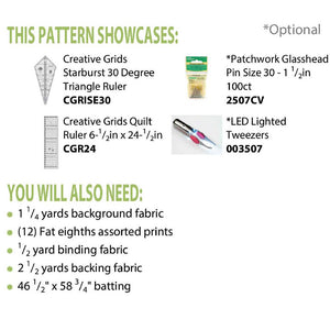 Designed by It's Sew Emma, the Kite Tales Quilt Pattern is a beginner to intermediate skill level design. To cut down on the cutting and assembly time the pattern uses Creative Grids' Starburst Ruler (not included). The Kite Tales Quilt Pattern finishes to approximately 36-1/2" by 48-3/4", making it the ideal sized lap blanket. The pattern includes a list of fabric requirements and detailed instructions.