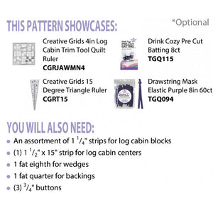 These Log Cabin Cozies from Cut Loose Press are the perfect gift you can create in just a few hours! Learn a clever quilt-as-you-go method and customize using your favorite 3" finished block or show off some machine embroidery. This pattern includes fabric requirements and instructions to create 3 cup cozies. You will need the Creative Grids, 4" Log Cabin Trim Tool, and the Creative Grids, 15 Degree Triangle Ruler, as well as a package of Gypsy Quilter Drink Cozy Pre-Cut Batting and a package of Drawstring Mask Elastics..