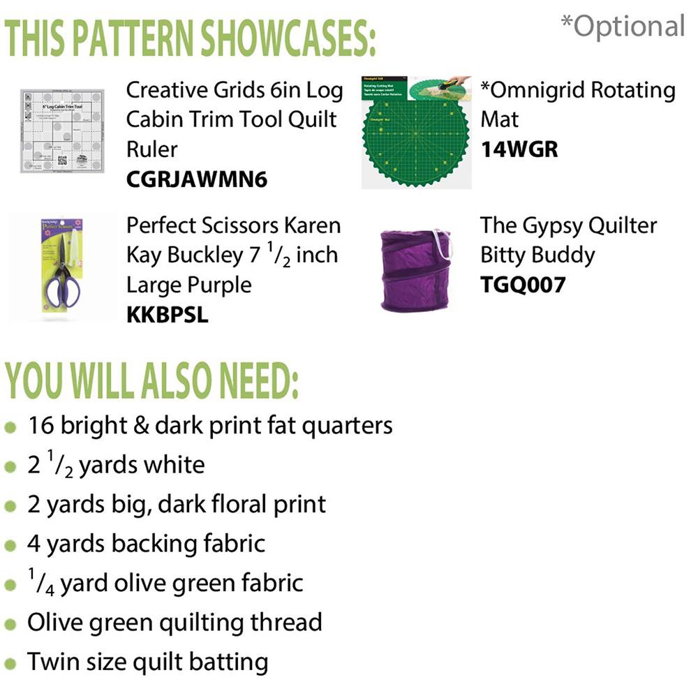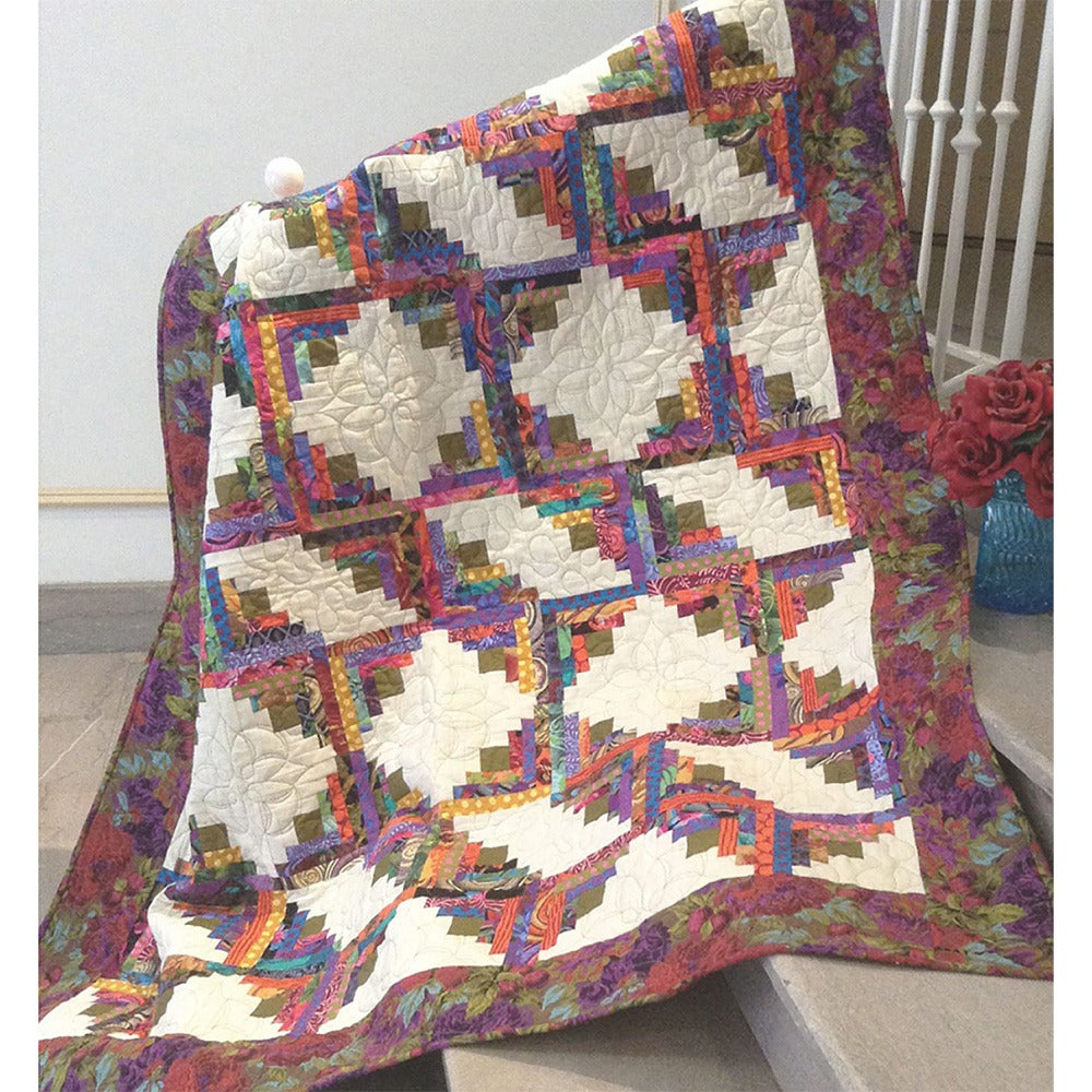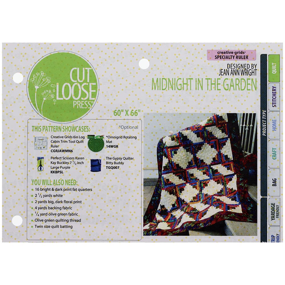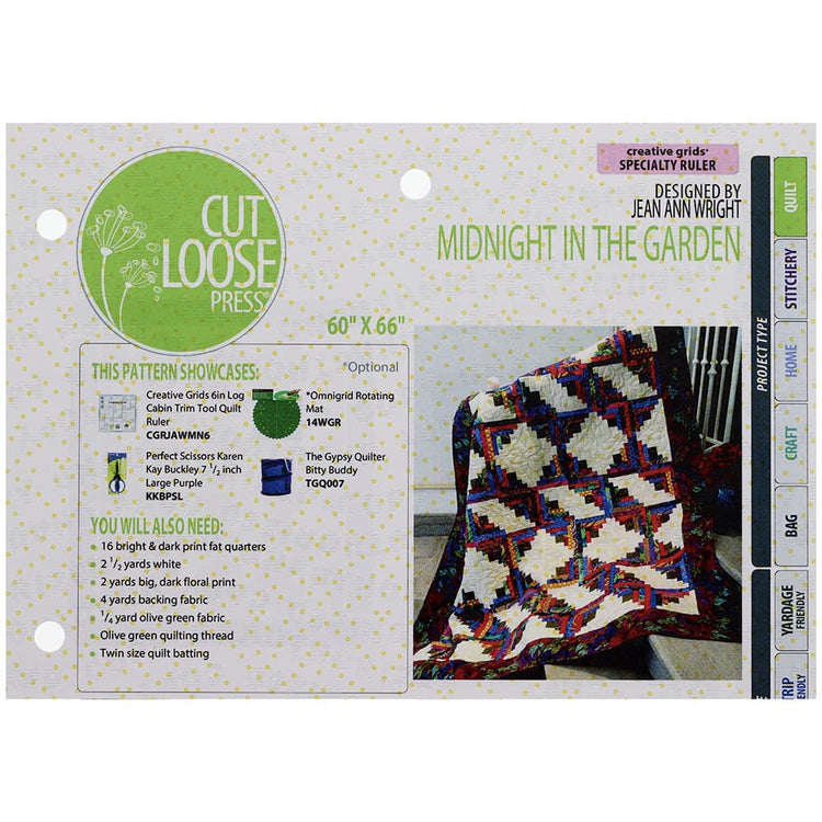 The Midnight in the Garden Quilt Pattern, designed by Jean Ann Wright for Cut Loose Press, is an excellent pattern for the confident beginner looking to advance their craft. Wright's design is perfect for gaining experience working with log cabin piecing. This design is fat quarter friendly and designed to be completed using the Creative Grids 6in Log Cabin Trim Tool (not included).