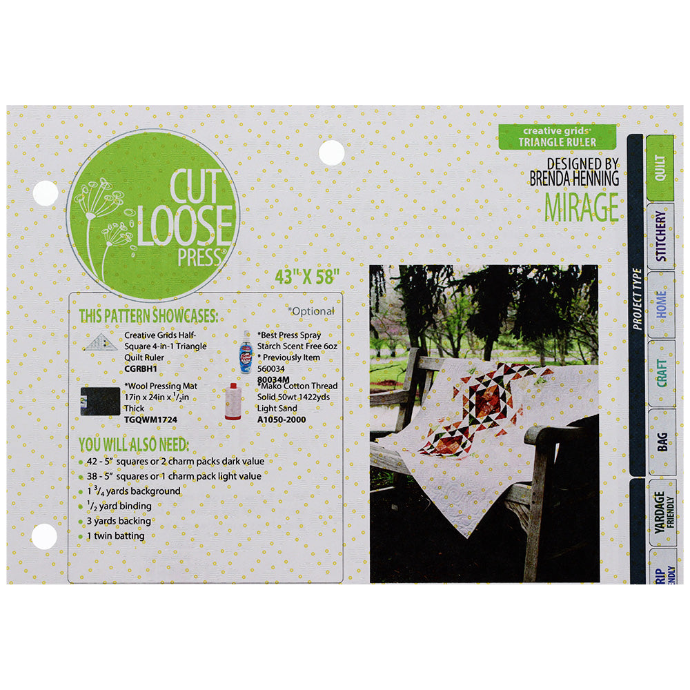 Who loves free-motion quilting? The only correct answer is that we all do! The Cut Loose Press Mirage Quilt Pattern (by Brenda Henning) is center-focused, leaving lots of room to play around the borders. Once all pieced together, you will have large swatches of solid background fabric to hone in on your free-motion skills, practice with new templates/rulers, or show off what you already know- making your personal design the focus. This pattern is designed to work with the Creative Grids Half-Square 4-in-1 Triangle Ruler (not included).