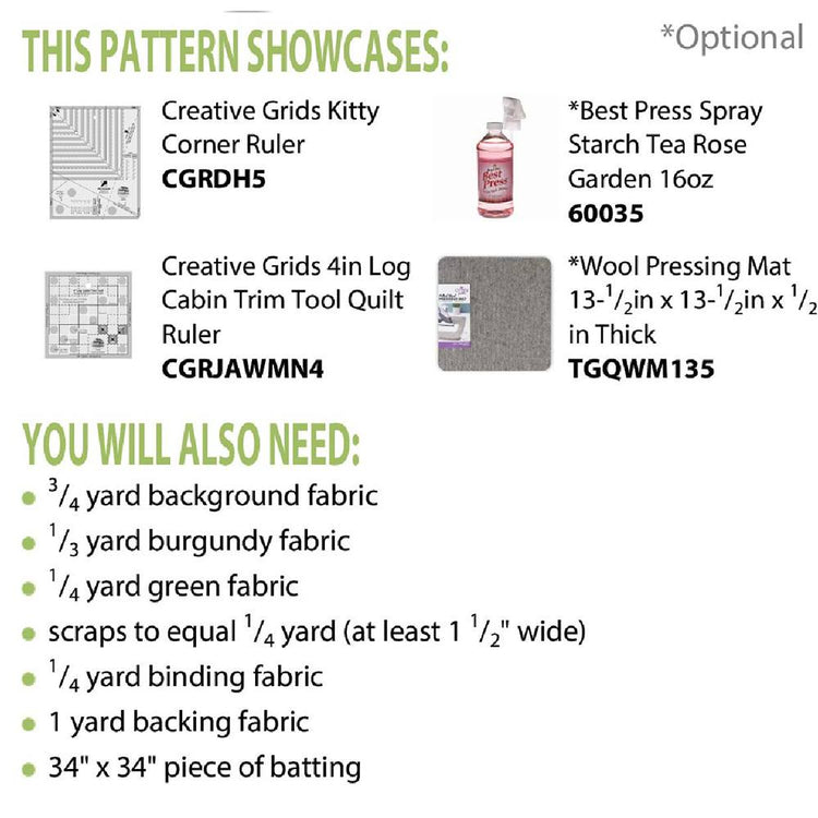 The Nostalgia Mini Quilt Pattern is an ideal weekend project. This 26" square pattern wouldn't look out of place in any room of your house! To speed up the cutting process, try using Creative Grids Kitty Cornered Ruler (not included). The Nostalgia Pattern makes an excellent wall hanging, table centerpiece, or conversation piece. This square friendly design includes step-by-step instructions as well as a list of fabric requirements.
