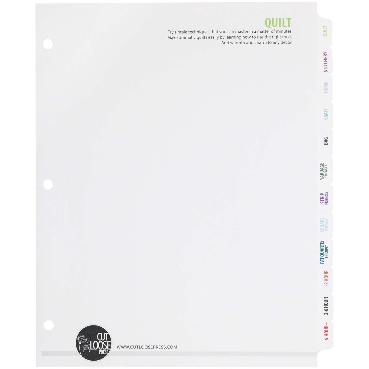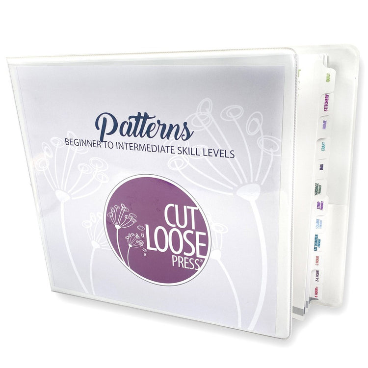 The Cut Loose Press Pattern Binder is the ultimate way to keep your patterns protected, organized, and ready for inspiration. Specially designed to fit Cut Loose Press patterns, this sturdy binder includes a set of 12 pre-printed tabs, making it simple to sort your projects by type, season, or size. The tabs allow you to quickly flip to exactly what you need, while the durable construction ensures your collection stays neat and in great condition. Whether you’re storing quilt designs, table runners, or seasonal favorites, this binder keeps your creativity organized and always within easy reach.