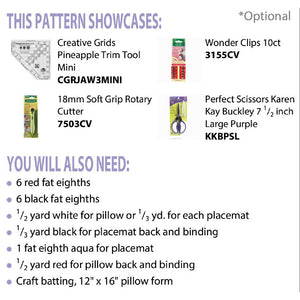 Create cute pillows or placemats with Jean Ann Wright's Pineapple Pillow or Placemat Pattern. This multi-purpose pattern uses Creative Grids Mini Pineapple Trim Tool (not included) to cut out the shapes required. The Pineapple Pillow Pattern is an intermediate design that can be made with fat quarters, 10" squares, or scrap fabric. The pillow finishes to 12" by 16" and the placemat measures 10" by 16". Detailed instructions and a list of suggested materials are included with the Pineapple Pillow or Placemat Pattern.