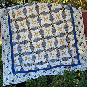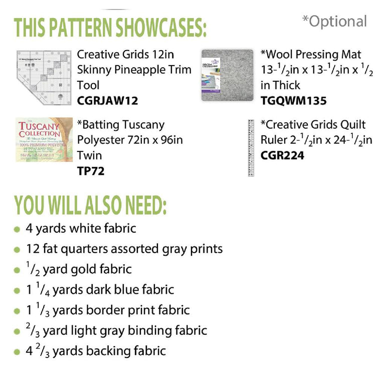 Try your hand at Jean Ann Wright's Pineapple Pinwheel Quilt Pattern. This intermediate skill level uses the Creative Grids Skinny Pineapple Trim Tool and the 2-1/2" x 24-1/2" Ruler (sold separately). This fun pattern combines two of the most popular quilt blocks into one fabulous design. The pinwheels are created by piecing the corner triangles before the final block trim. When four blocks are sewn together, the secondary pinwheel pattern is formed. The Pineapple Pinwheel Quilt Pattern includes all the instructions you will need as well as a suggested tools list. Pattern finishes to 60" by 72".