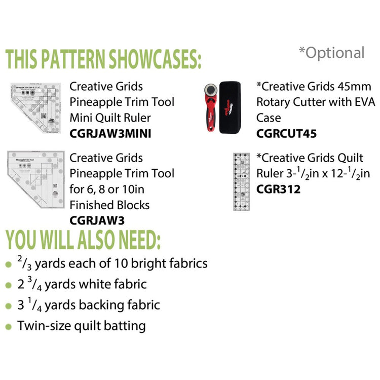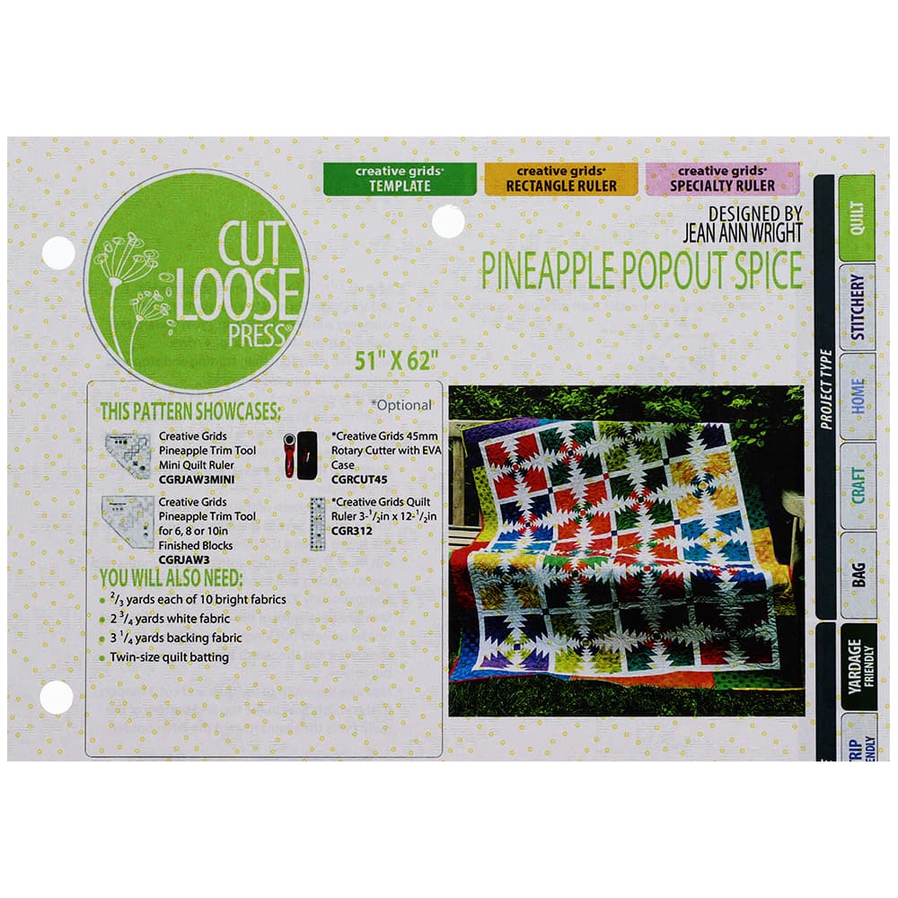 Designed by Jean Ann Wright, The Pineapple Popout Spice Quilt Pattern from Cut Loose Press presents a brand new technique featuring the Pineapple Trim Tool and the Pineapple Trim Tool Mini (required to complete this design). The center pineapple is made with the Pineapple Trim Tool Mini with rounds that finish at 1/2 ". Additional rounds are added and trimmed with the Pineapple Trim Tool creating 1" finished rounds. The Pineapple Popout Spice Quilt Pattern includes instructions and fabric requirements to make the project shown, recommended for intermediate-level sewists.