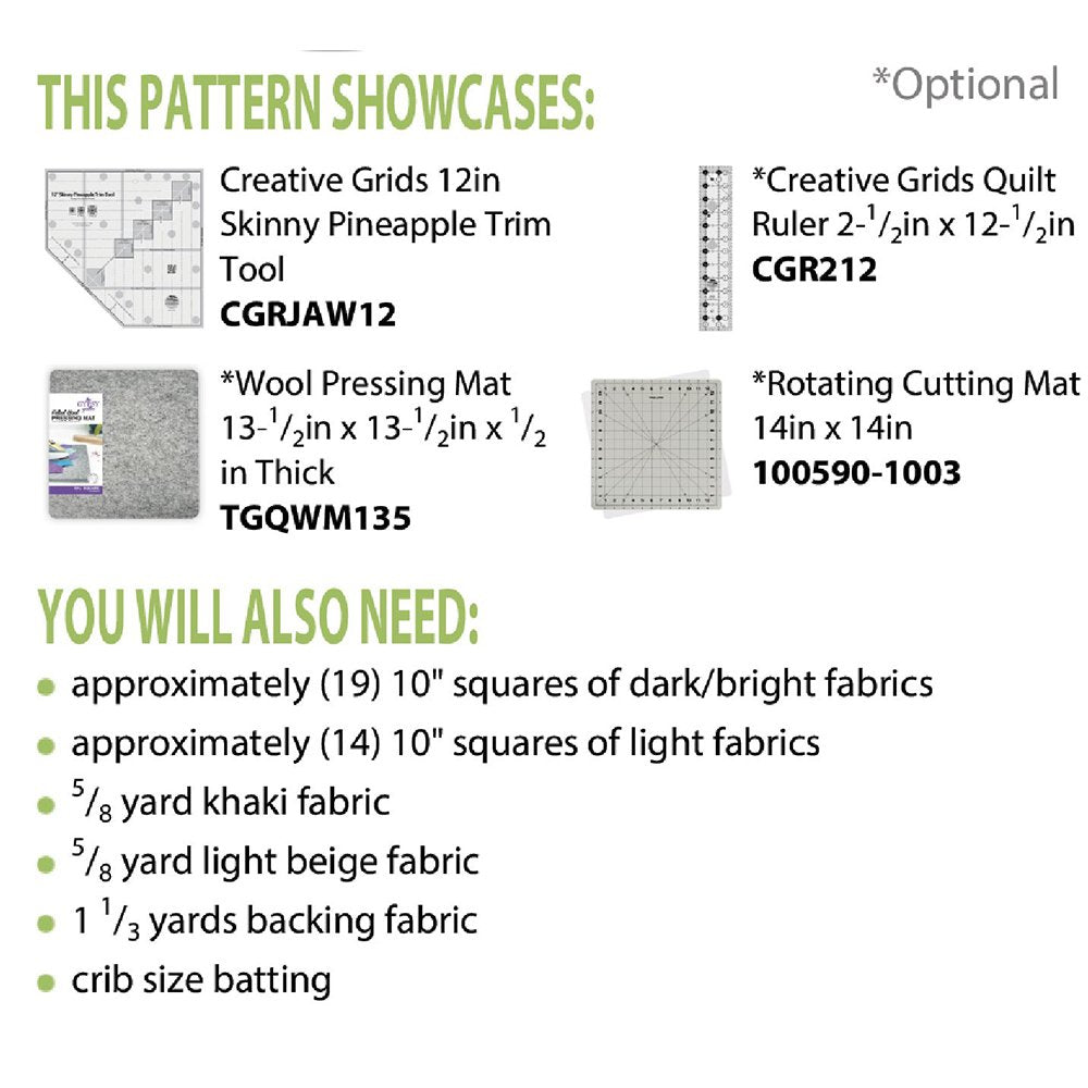 Designed by Jean Ann Wright, the Pineapple Puzzle Mini Quilt Pattern is an intermediate pattern that will show you how to create perfect pineapple blocks. You will need Creative Grids Skinny Pineapple Trim Tool and the 2-1/2" x 12-1/2" Ruler (sold separately). This 30" by 42" pattern combines 6" and 12" blocks to create a unique design. Use fat quarters or 10" squares to complete your own version of this fun quilt. The Pineapple Puzzle Mini Quilt Pattern includes detailed instructions and a list of suggested tools.