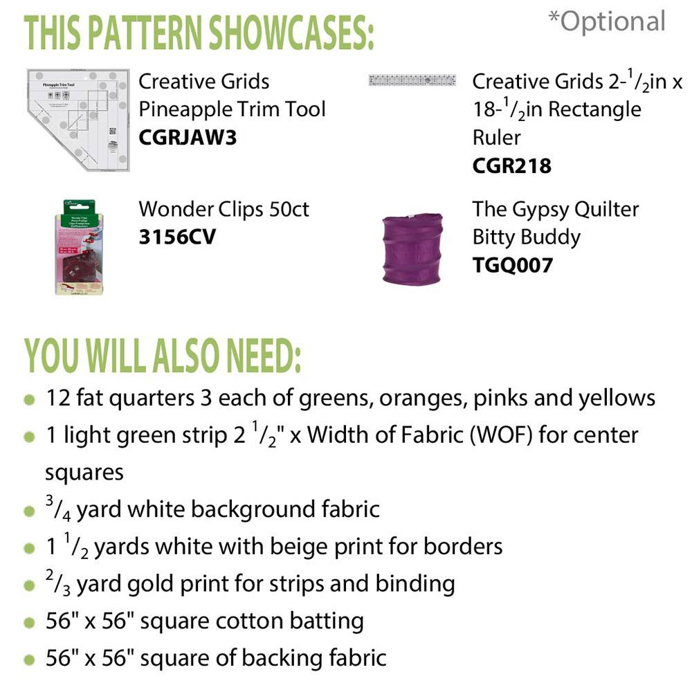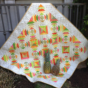 Aloha quilters! The Pineapple Rings Quilt Pattern was designed by Jean Ann Wright for Cut Loose Press for the intermediate quilter looking to make a tropical summer quilt! Master the pineapple block with Wright's outstanding design. This pattern requires the Creative Grids Pineapple Trim and 2-1/2" x 18-1/2" Rectangle quilting rulers (not included).