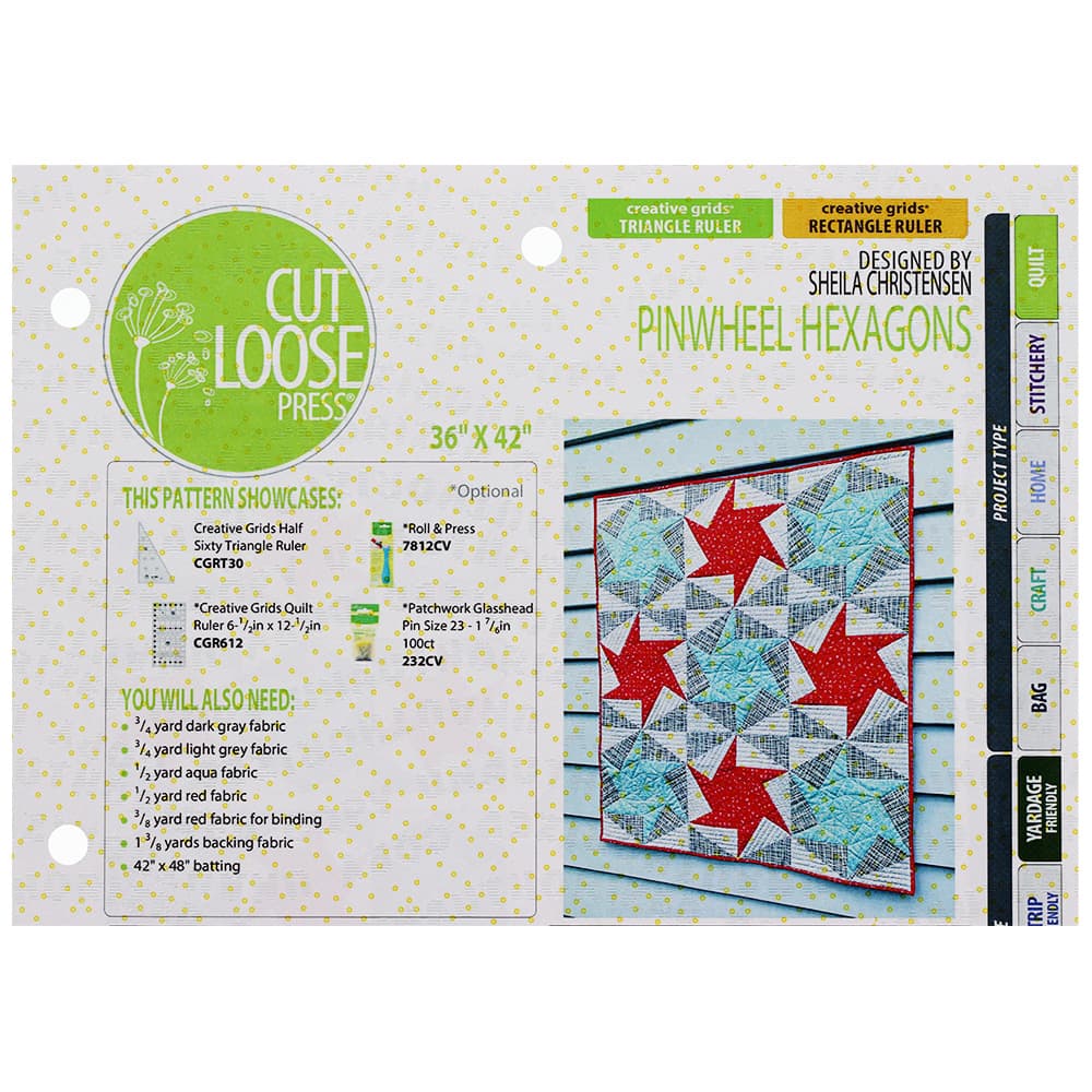 The Cust Loose Press Pinwheel Hexagons Wall Hanging Quilt Pattern, designed by Sheila Christensen, is an intermediate design composed mostly of hexagonal blocks. This pattern is an excellent quilt-in-a-day project for an experienced quilter or a confident beginner. You will need to use the Creative Grids Half Sixty Triangle and 6-1/2" x 12-1/2" quilting rulers (not included).