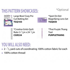 The Popcorn Bowl Cozy, designed by Carolina Moore, is made with microwave-safe Gypsy Quilter, Large Bowl Cozy Pre-Cut Batting. You can create the 13" by 13" bowl cozy with just a few hours of your day! These make great gifts for friends and family or a quick pattern to teach or complete in a class. The Creative Grids 3-1/2" x 24-1/2" Quilting Ruler is recommended.