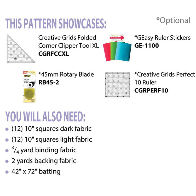 Liven up your kitchen table with Cut Loose Press's Reflections Table Runner & Placemats Pattern. This intermediate skill level design uses Creative Grids' XL Folded Corner Clipper Tool and 10" fabric squares (not included). Once completed, the table runner finished to 15" by 38" and the placemats measure 12" by 15". Detailed instructions and a suggested materials list is included with the Reflections Table Runner & Placemats Pattern.
