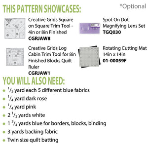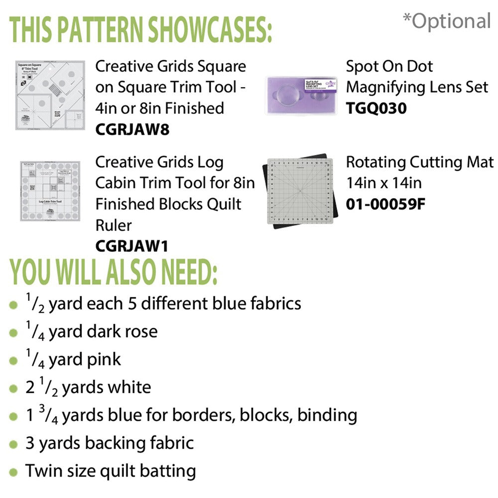 Designed by Jean Ann Wright, the Rosebud Trails Quilt Pattern is a fun and challenging blueprint that will bring your piecing skills to the next level. This design is the perfect summer project or gift for the floral fanatic in your life. Complete the Rosebud Trails Quilt with ease using the Creative Grids Square on Square and Log Cabin trimming tools (not included).