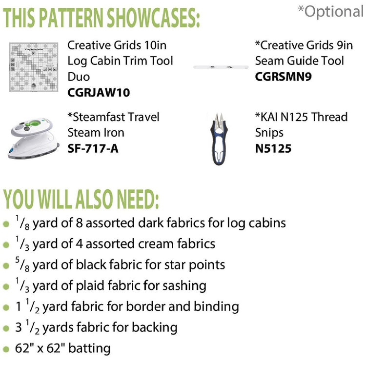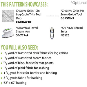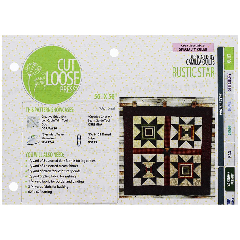 Cut Loose Press partnered with Camilla Quilts to bring you the Rustic Star Quilt Pattern! This pattern is for the confident beginner who is looking to work with half-square triangles and log cabins! This project was designed to be completed using the Creative Grids 10" Log Cabin Trim Tool Duo (not included).