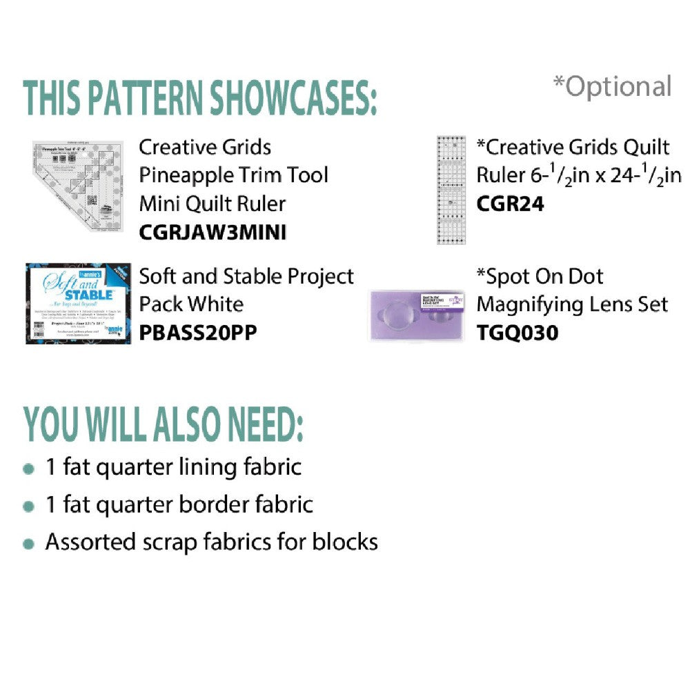 to create the crazed quilt effect while adding excitement to the pouch and also the Creative Grids, 2-1/2" x 12-1/2" Quilting Ruler. This design is an awesome way to build your bag-making skills! The Scrap Tape Zip Pouch Pattern includes instructions to make a finished product size of 4" by 4" by 10-1/2". Learn how to make a standing bag by boxing the corners and easy installment of a zipper! Recommended for confident-beginner level sewists.
