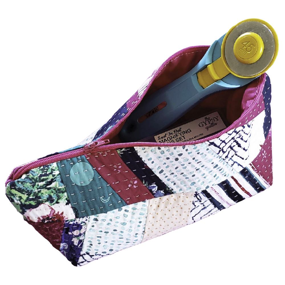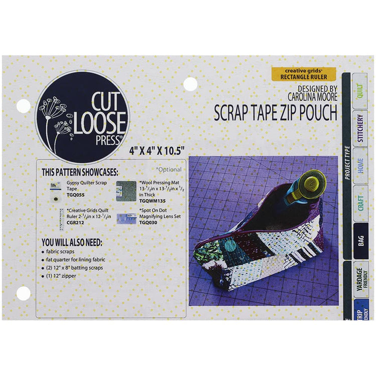 Designed by Carolina Moore, the Scrap Tape Zip Pouch Pattern by Cut Loose Press is made with a fat-quarter, scraps, and batting. It is recommended to use the Gypsy Quilter Scrap Tape