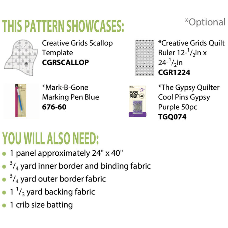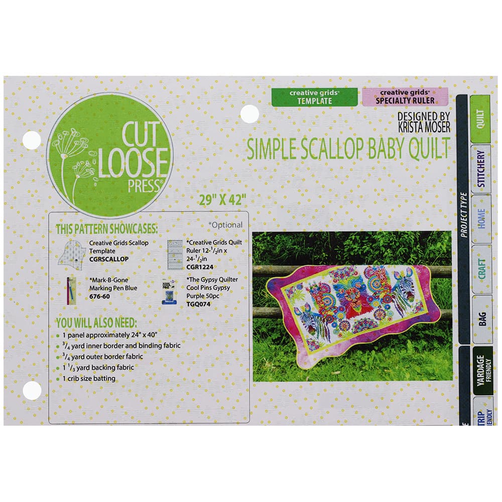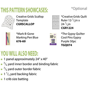 If you need a quick and easy project, look no further than Krista Moser's Simple Scallop Baby Quilt Pattern from Cut Loose Press. This 29" by 42" mini blanket uses a standard-sized panel (24" by 40") as the centerpiece, so you just have to create the border. It's recommended that you use Creative Grids Scallop Template and their Big Easy Ruler (not included) to cut out your border. The Simple Scallop Baby Quilt Pattern is yard and fat quarter friendly and can be completed in as little as a day. Included with the pattern are detailed instructions and a suggested list of materials.