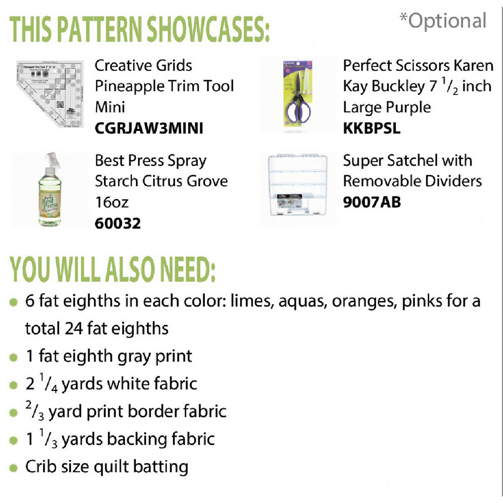 Jean Ann Wright's South Beach Pineapple Treats Quilt Pattern is a fun, colorful quilt that is fat eighth friendly. This quilt is best suited to confident sewists who have experience cutting and piecing. To make the cutting process more manageable, it's recommended that you use Create Grids Mini Pineapple Trim Tool (not included). The South Beach Pineapple Quilt Pattern finishes to 37" by 43", making it the ideal lap or baby blanket. Included with the pattern, you get detailed instructions and a list of suggested tools.