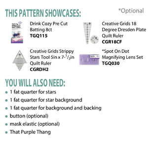 The Starry Drink Cozy, designed by Carolina Moore, uses three coordinating fat-quarters and a few Creative Grids rulers to complete these fun cozies! The Creative Grids Strippy Star Tool is used to create the adorable star; however, any 3" finished block would work just as well. If you own an embroidery machine, you can even customize it with any 3" design or monogram. The Gypsy Quilter Drink Cozy Pre-Cut Batting shields your hand from the heat of the cup, while it is also the template for the unique shape required to encase a cup.
