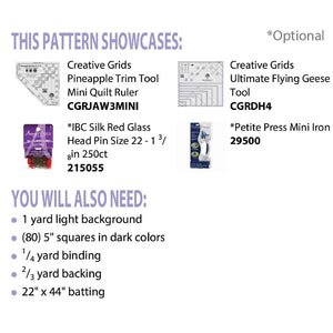 The Taffy Pinwheels Table Runner Pattern from Deb Heatherly is an intermediate skill level design. This colorful pattern is fat quarter, scrap fabric, and 5" square friendly. Due to all the cutting required in the pattern it's recommended that you use Creative Grids Mini Pineapple Trim Tool and the Ultimate Flying Geese Ruler (not included). The table runner finishes to 17-1/2" by 35-1/2" and makes a great centerpiece for every season. All the instructions you will need as well as a list of suggested materials are included with the Taffy Pinwheels Table Runner Pattern.