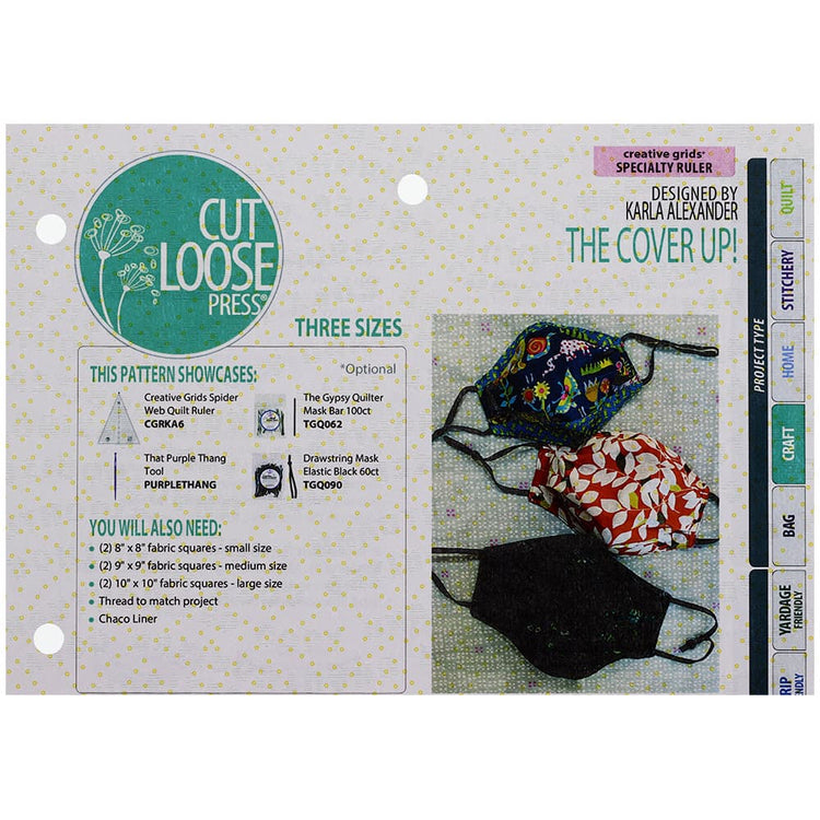 Let's face it; face masks will be a part of our culture for the foreseeable future. The Cover Up Face Mask Pattern, designed by Karla Alexander, is an excellent design for creating secure, well-fitted face coverings. We sewers love making masks because it's easy and quick, making it a fantastic project for practicing or keeping busy. This pattern comes in three sizes (child, women, men) and showcases the Creative Grids Spider Web Ruler (not included)
