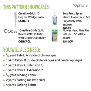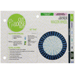 The Wagon Wheel makes a great centerpiece in any room. You can place it on a bed, drape it along the back of the couch, or use it as a table cloth. Designed by Cheryl Phillips and Cut Loose Press, the Wagon Wheel Pattern requires the use of the Creative Grids 10 Degree Wedge Ruler (sold separately). Included with the Wagon Wheel Pattern is a full set of instructions and a list of fabric requirements. Finished quilt measures approximately 65" square. This pattern is considered an intermediate skill level.