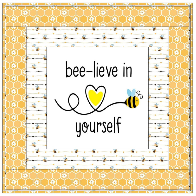 The Cute Bee-lieve In Yourself Wall Hanging includes everything that you need to make the quilt - the instructions and a total of 3 1/2 yards of fabric and a 23" panel. It has two borders and is finished with a flange binding. Batting is sold separately. The finished size of this quilt is 42" x 42".