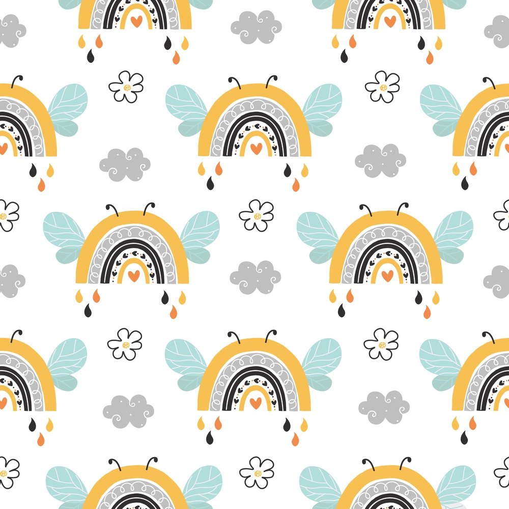 Cute Bees Rainbows with Flowers Fabric - White Details