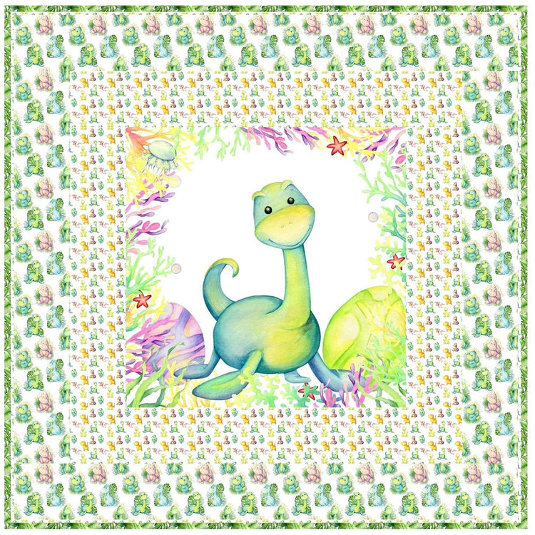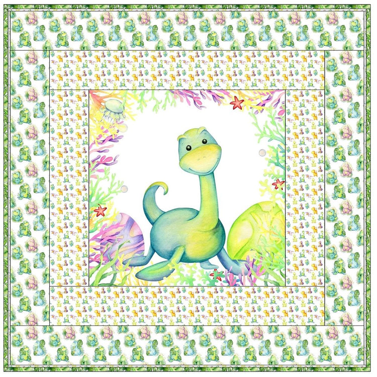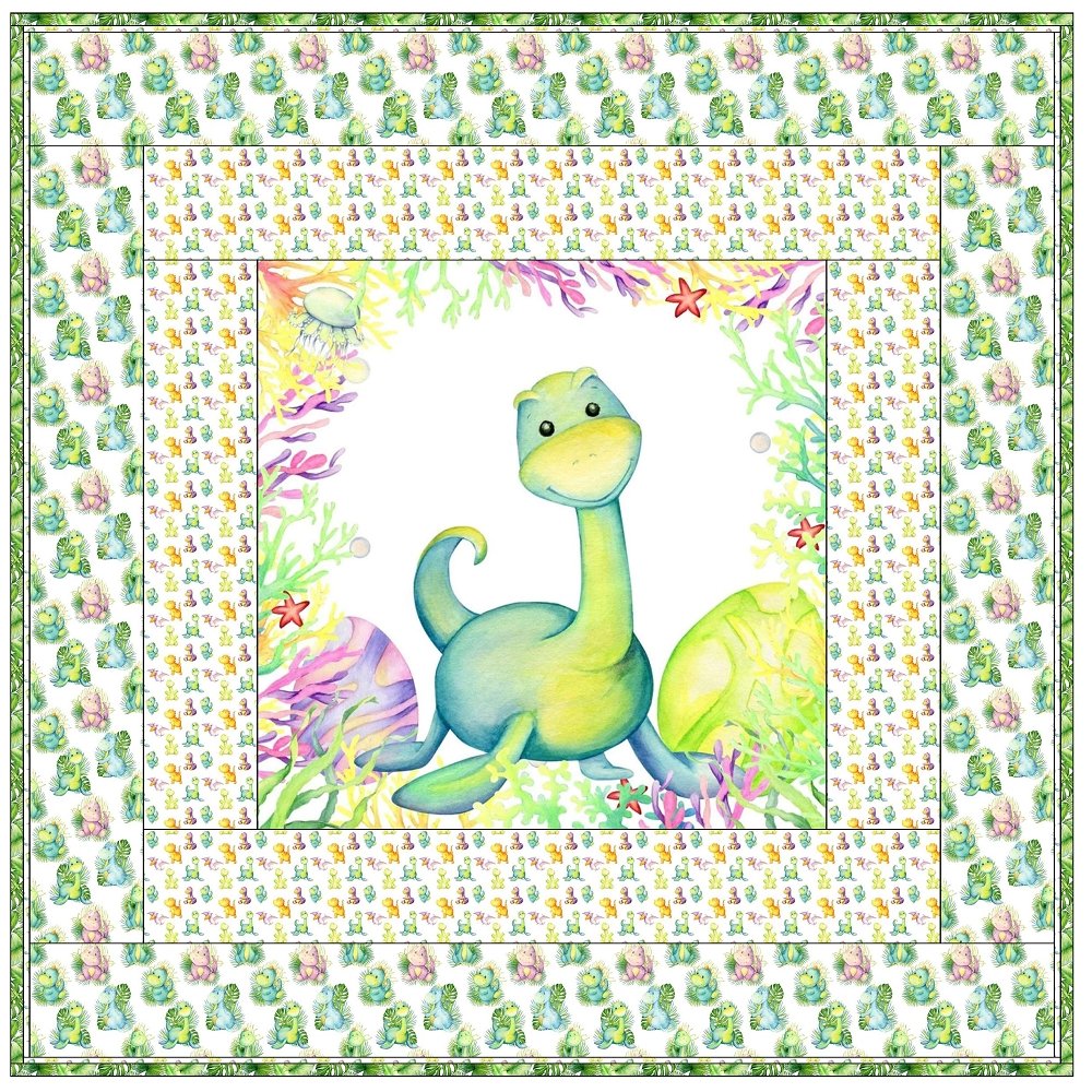 The Cute Colorful Dinosaur Wall Hanging includes everything that you need to make the quilt - the instructions and a total of 3 1/2 yards of fabric and a 23" panel. It has two borders and is finished with a flange binding. Batting is sold separately. The finished size of this quilt is 42" x 42".