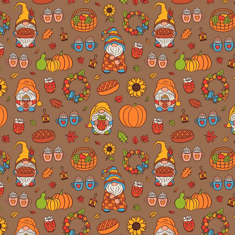 The Brown Cute Cozy Gnomes Fabric is part of the Cute Fall Gnomes Fabric Collection printed by Sew Creative Fabrics. Digitally Printed on 100% cotton.