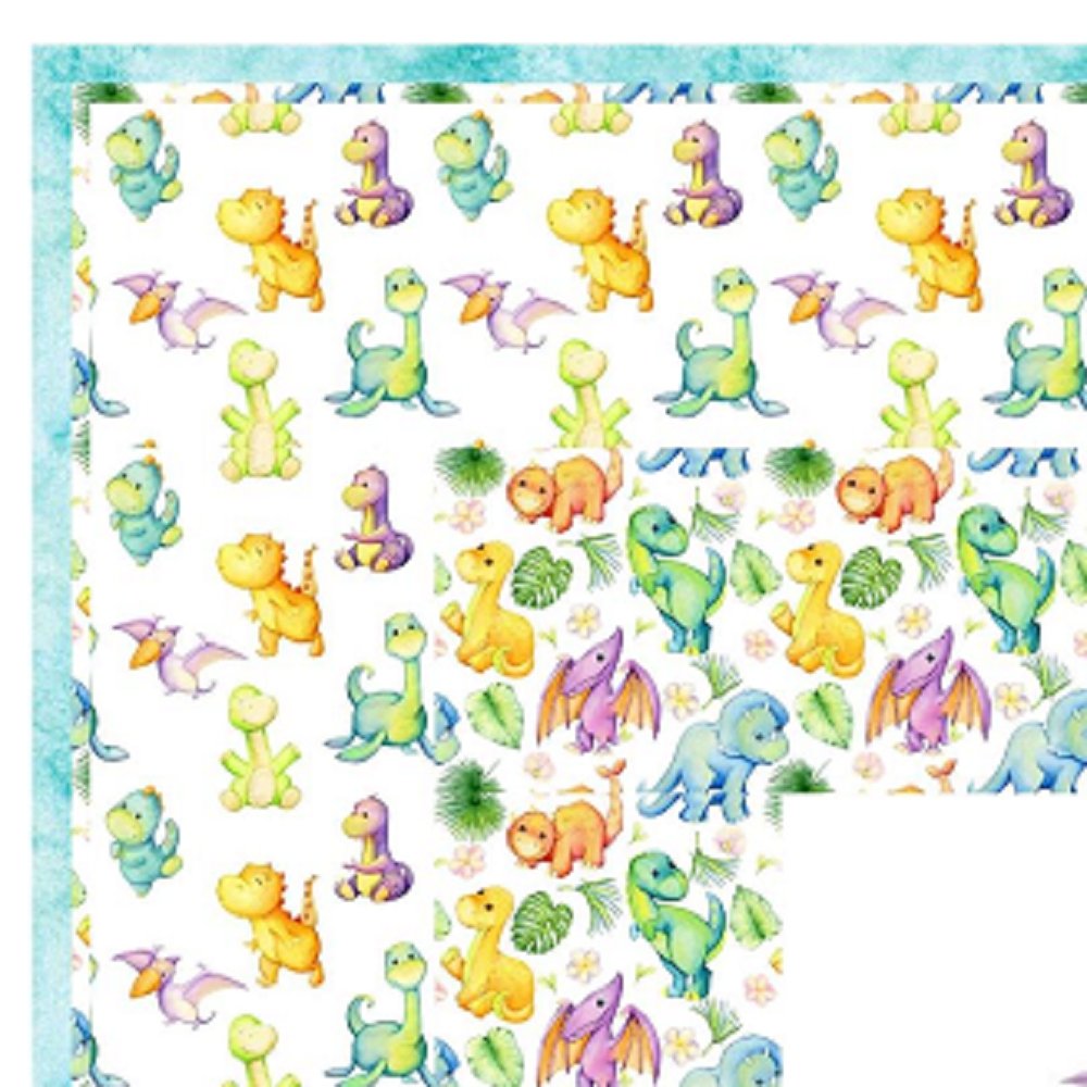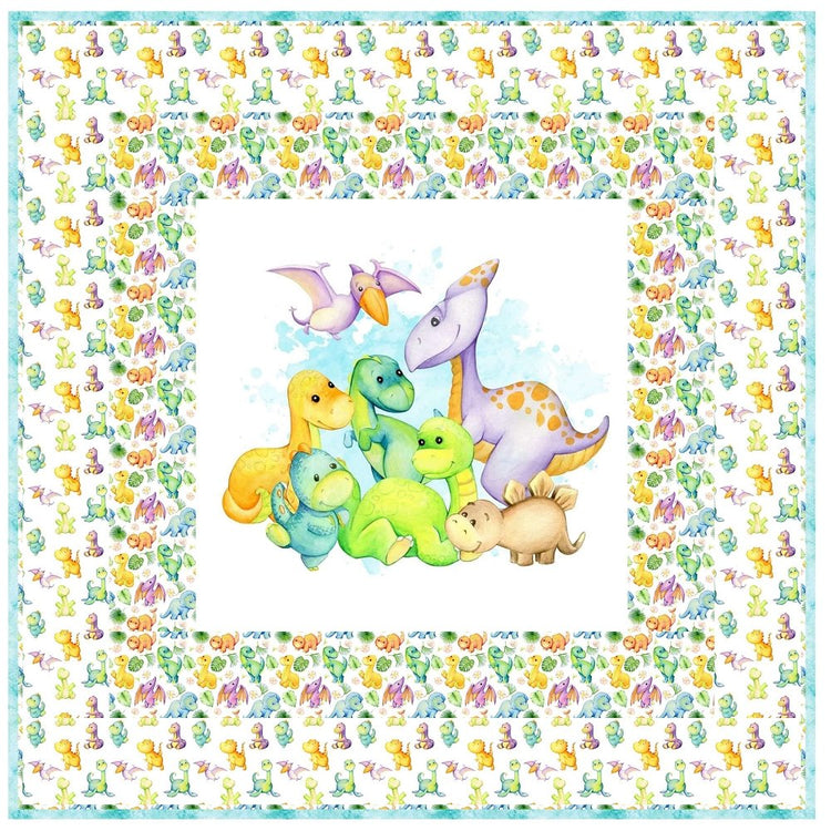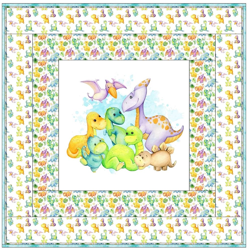 The Cute Dino Family Portrait Wall Hanging includes everything that you need to make the quilt - the instructions and a total of 3 1/2 yards of fabric and a 23" panel. It has two borders and is finished with a flange binding. Batting is sold separately. The finished size of this quilt is 42" x 42".