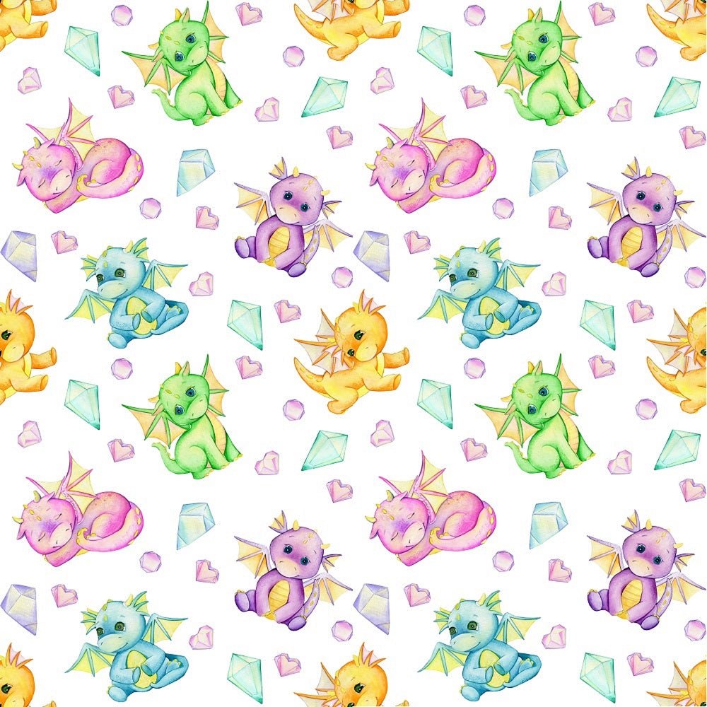 Cute Dragons Hearts & Crystals Fabric - White Details