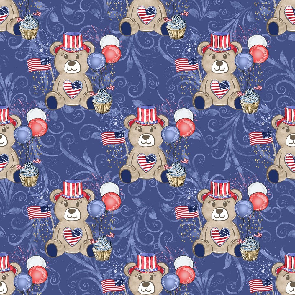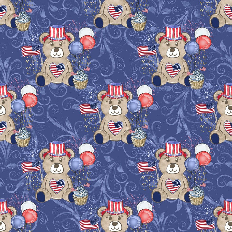 The Blue Cute Patriotic Bears on Swirls Fabric is part of the Cute Patriotic Bears Fabric Collection printed by Sew Creative Fabrics. Digitally Printed on 100% cotton.