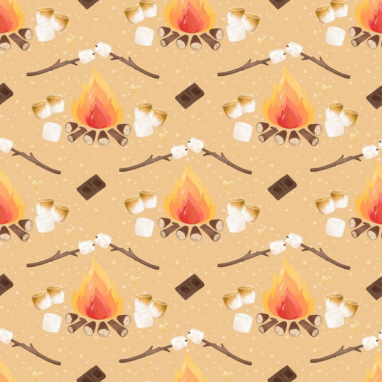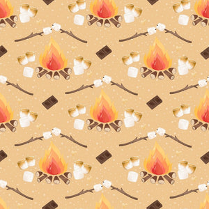 Cute Smores Campfire on Dots Fabric - Tan