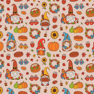 The Tan Cute Thanksgiving Gnomes Fabric is part of the Cute Fall Gnomes Fabric Collection printed by Sew Creative Fabrics. Digitally Printed on 100% cotton.