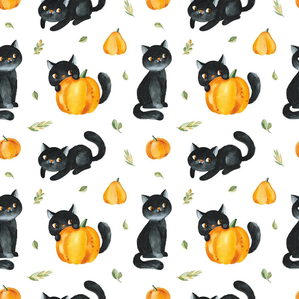 Cute Watercolor Black Cats & Pumpkins Fabric Details
