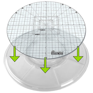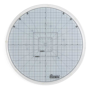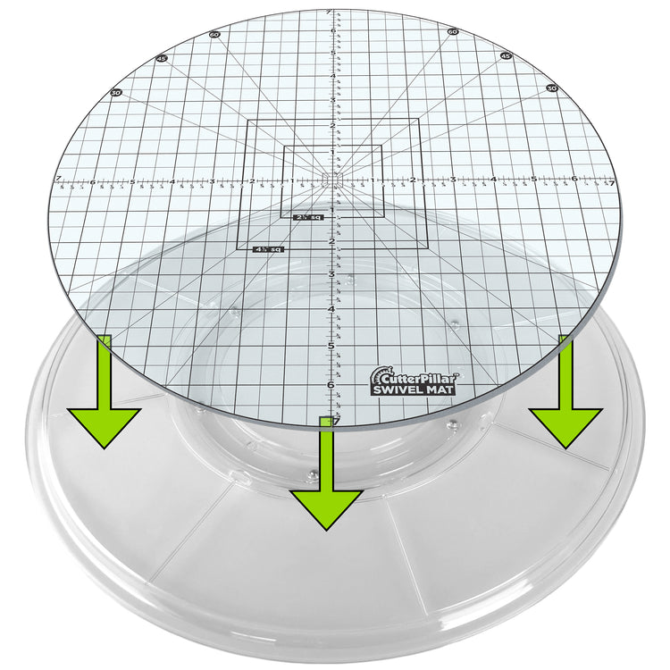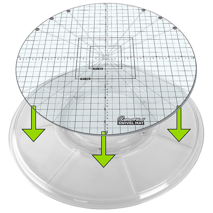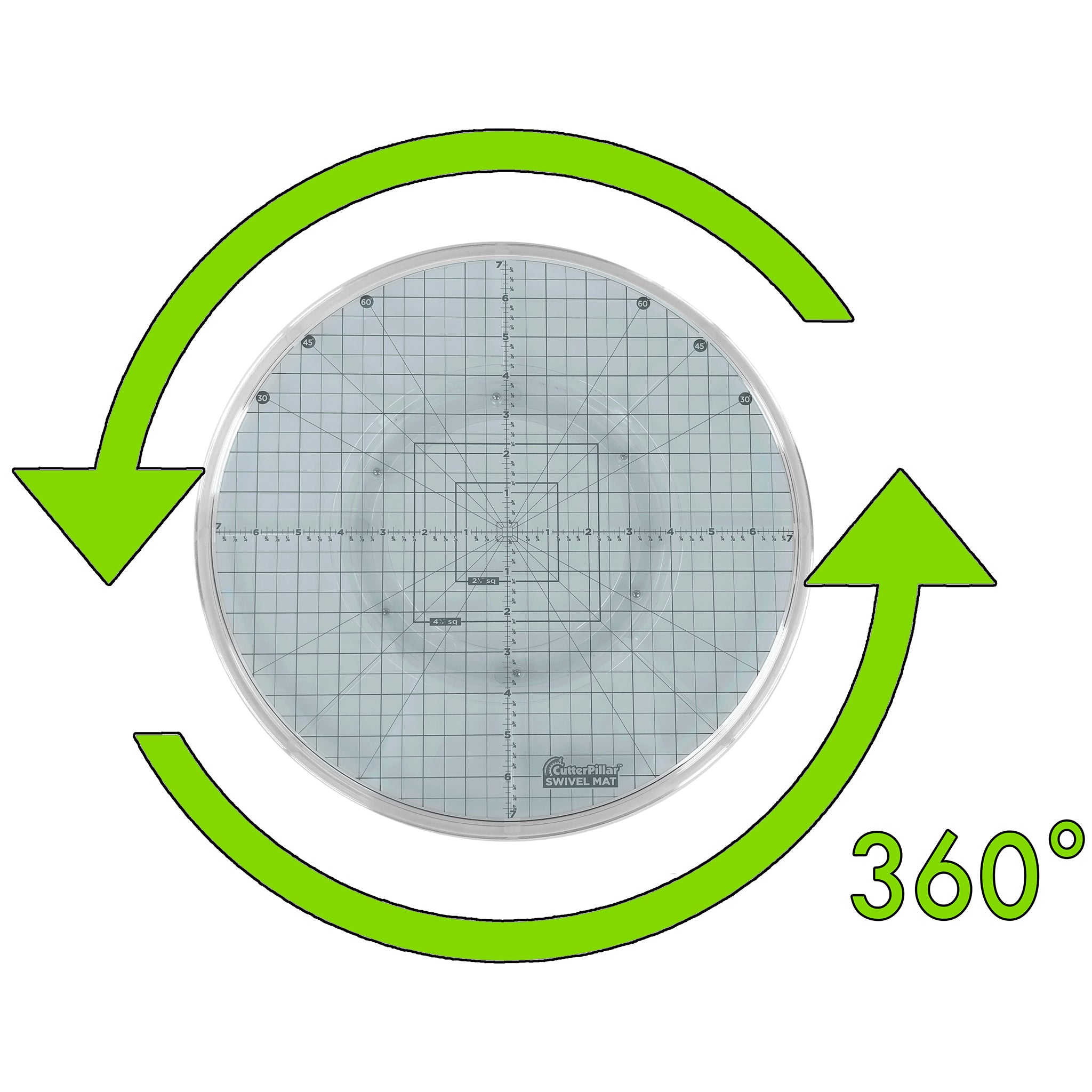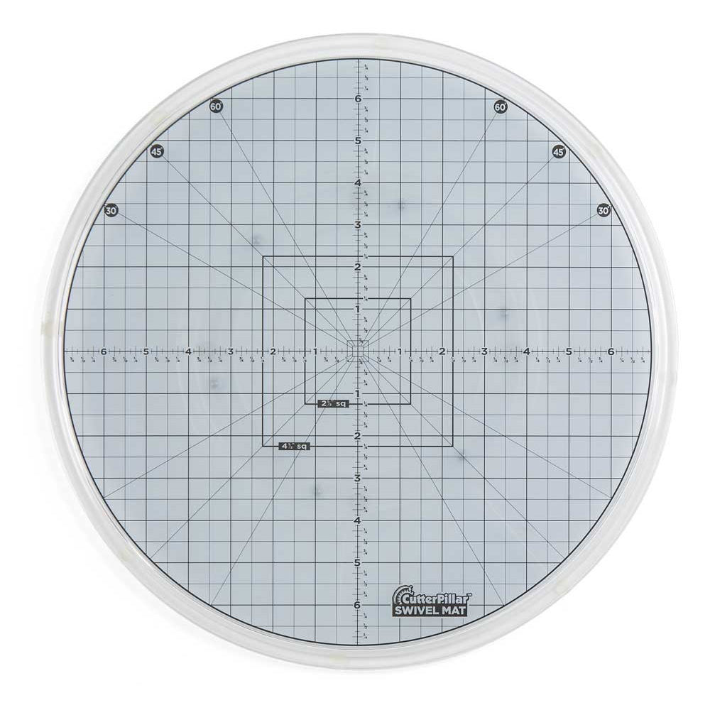 Cutterpillar 14" Swivel Rotating Cutting Mat is a swivel, self-healing, rotating mat that spins on steel ball bearings for the smoothest spinning experience. It even has silicone feet on the bottom to keep the mat from turning while cutting. The Swivel Rotating Cutting Mat is ideal for quilting, sewing, pattern cutting, fabric cutting, and even shape tracing and transfer. The base and cutting mat are translucent, so you can easily pair them with a glow board for illuminated cutting. Both sides of the mat can be used, so you get all the benefits of a rotating mat with the bonus of the light shining through your fabric and paper. The durable PVC 3/16" thick mat includes ruler measurement marks with fractions printed next to them, standard quilting angles, vertical and horizontal rulers, and common squares. Cutting different shapes can be tricky, so make it easier with Cutterpillar's Swivel Rotating Cutting Mat. Instead of turning your body into awkward positions, turn your cutting mat instead! *Notions pictured are not included.