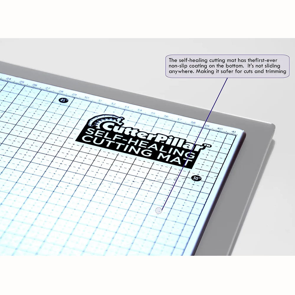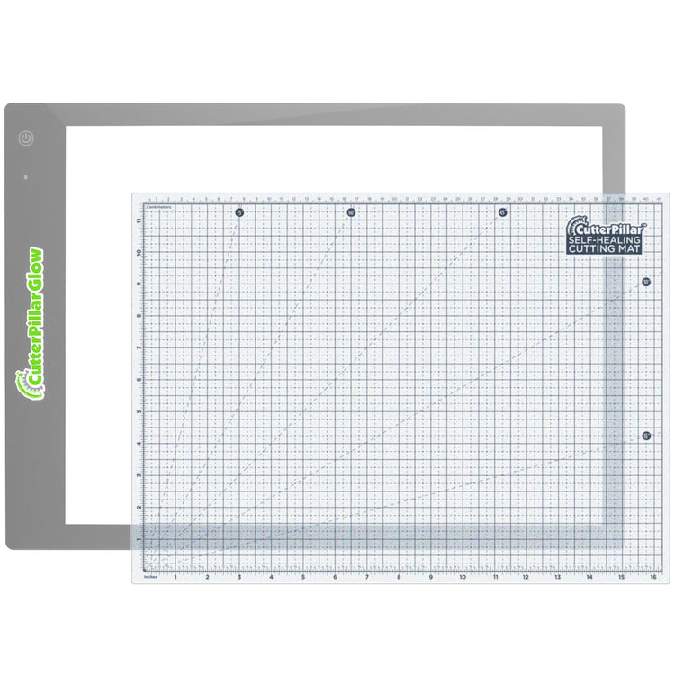 Cutterpillar Glow Premium LED Lightpad and Cutting Mat is an illuminated light tablet for all your sewing and crafting projects. Use it with tracing, paper-piecing, applique, fussy-cutting, crosstitching, calligraphy, and much more. Like the Basic version, the Premium has three levels of LED illumination controlled by a convenient switch, so you get the most comfortable lighting environment possible. The flicker-free LED lights never get hot to the touch and last up to 50,000 hours. It comes with a one-of-a-kind translucent, non-slip, self-healing cutting mat that allows for extended cutting with most cutting tools, i.e., rotary cutters and craft blades. The mat even has easy-to-see grid lines and multiple rulers and angles. The main difference between the two mats is that the Premium allows you to be cord-free! Cutterpillar Glow Premium includes an internal rechargeable battery, allowing up to 4 hours of portable crafting. It does come with a USB cord and wall plug for easy charging. You can also charge it with most USB power sources like a sewing machine or computer. The Glow Basic measures approximately 13" by 19" and has a lighted area of 12" by 16".