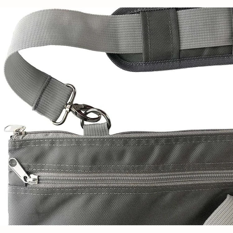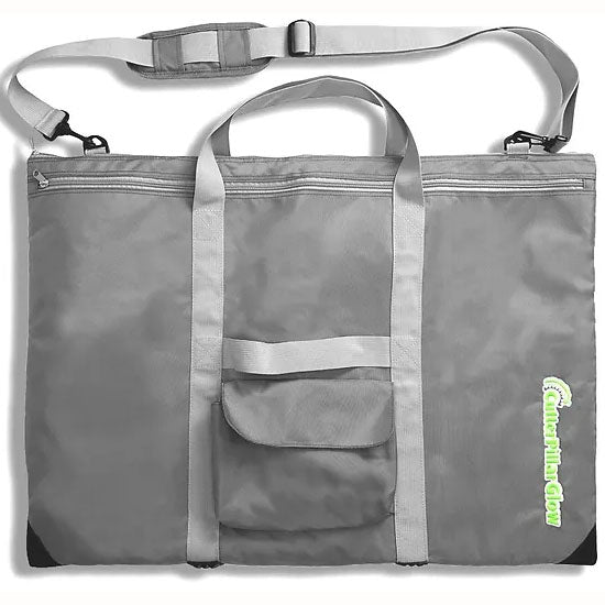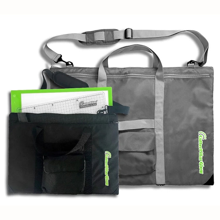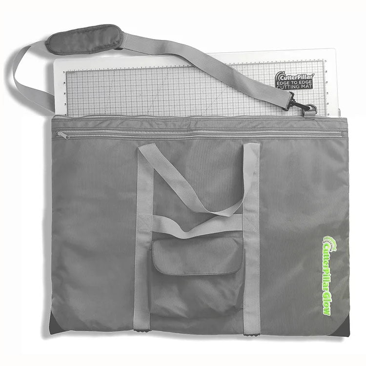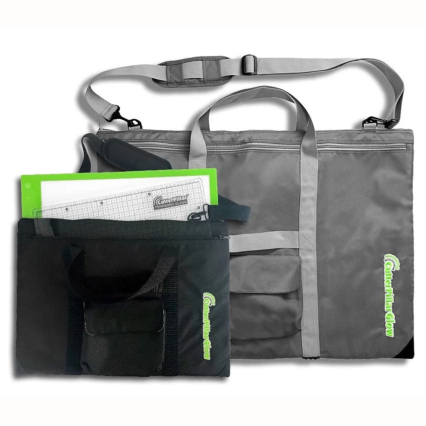 This CutterPillar Ultra Tote is designed to take your Cutterpillar Glow Ultra on the go with no hassle. The Ultra Glow Mat will fit comfortably in this tote. This tote features a removable shoulder strap, an outer zipper for plug and cord, a screened logo along the side, and a full-sized pocket for your rulers and patterns. This tote is also made from sturdy vinyl with extra padding. The long shoulder strap makes it easy to carry your cutting mats and notions wherever you go. The bag measures 20" x 27" 3". This solid and sturdy neoprene bag offers multiple carrying handles and an inner divider for your glass mat or self-healing mat.