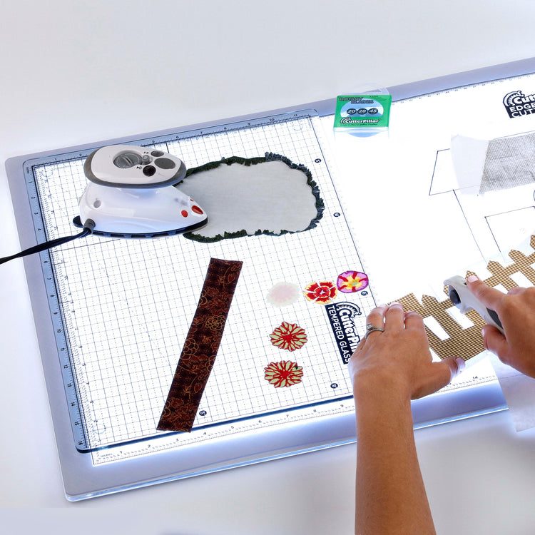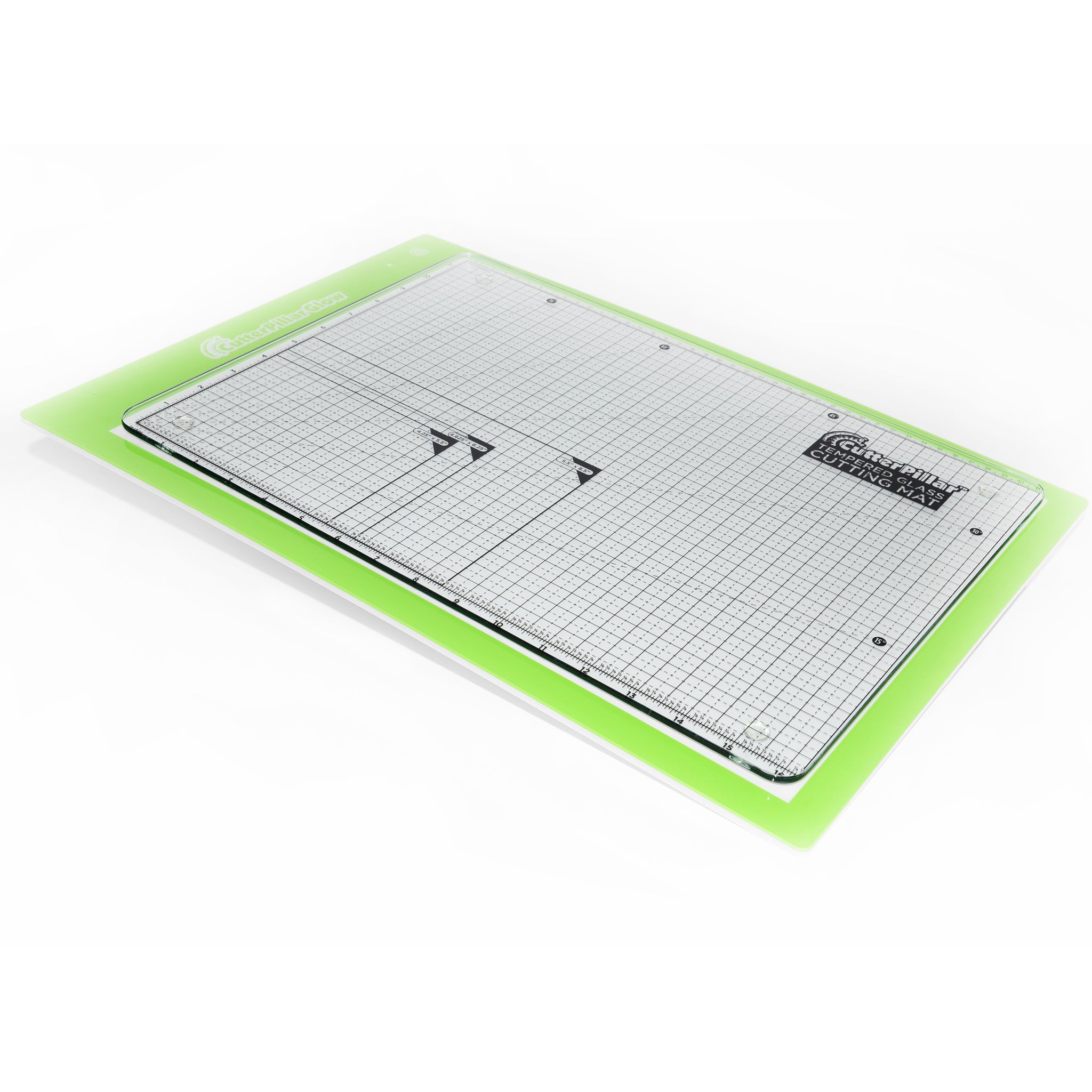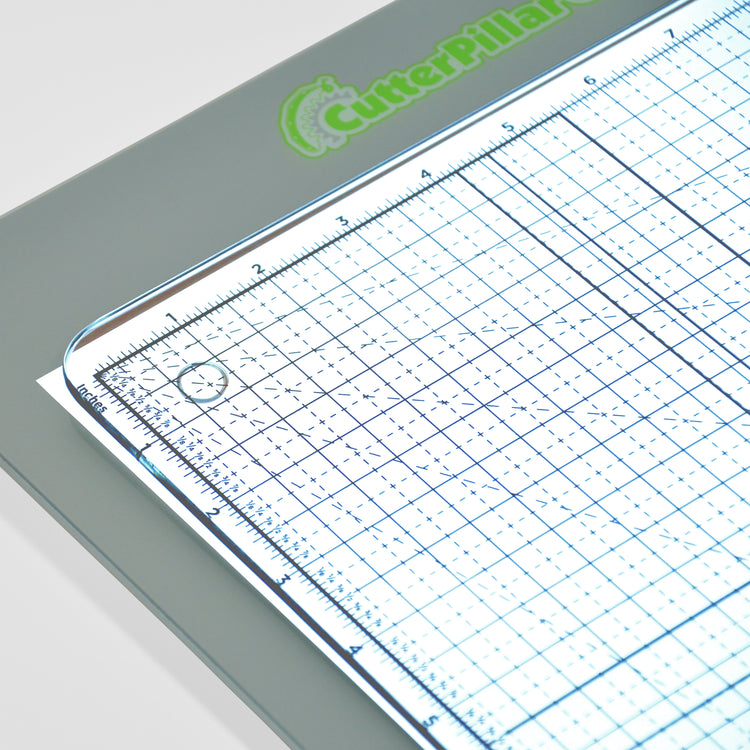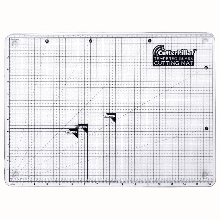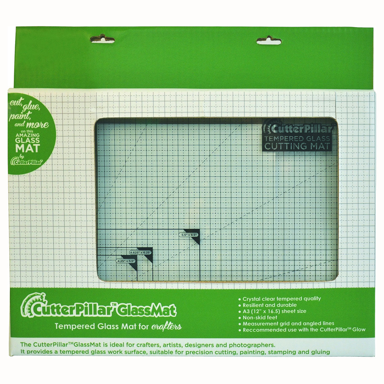 The CutterPillar Tempered Glass Cutting Mat is 20 times harder than regular glass, making it ideal for crafters, artists, designers, and photographers. You can cut, paint, stamp, or glue on it since it's virtually stain-proof! It's the perfect companion for the CutterPillar Glow when you need a harder surface than the standard self-healing mat! Anything that sticks can be washed or razored off without worrying about scratching the surface. It is also resistant to heat so you can iron on it too! This safety glass won't break into shards like regular glass would. This mat has angle lines, along with a 1/2 and 1/4-inch grid system that can be used for sewing and quilting. Along the bottom are soft rubber feet that will keep the mat stable on any surface. Cutterpillar Tempered Glass Cutting Mat measures approximately 12" by 16.5".