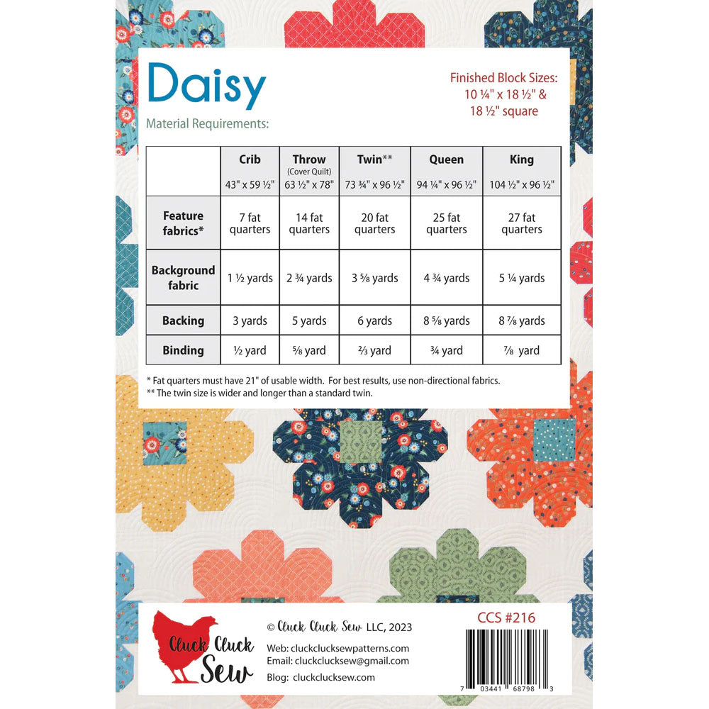 Designed by Allison Harris, the Daisy Quilt Pattern from Cluck Cluck Sew is traditionally pieced and looks lovely in any fabric choice. Each finished block measures 10-1/4" by 18-1/2" and 18-1/2" square. This design is fat-quarter-friendly and recommended for intermediate beginner sewists. The pattern includes instructions to create a crib, throw, twin, queen, and king-sized quilts. For best results, use non-directional fabric and Diagonal Seam Tape. The Daisy Quilt Pattern has detailed instructions and a suggested list of materials.