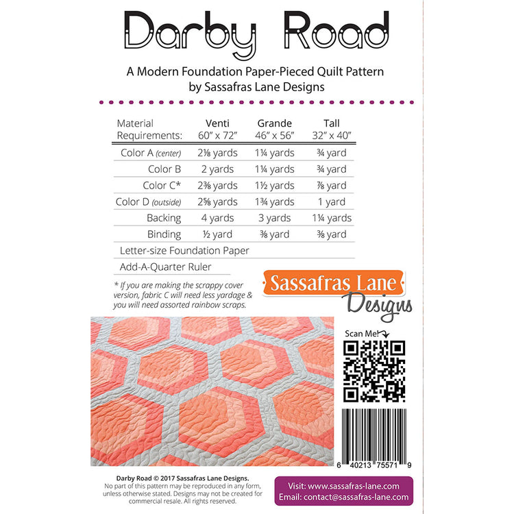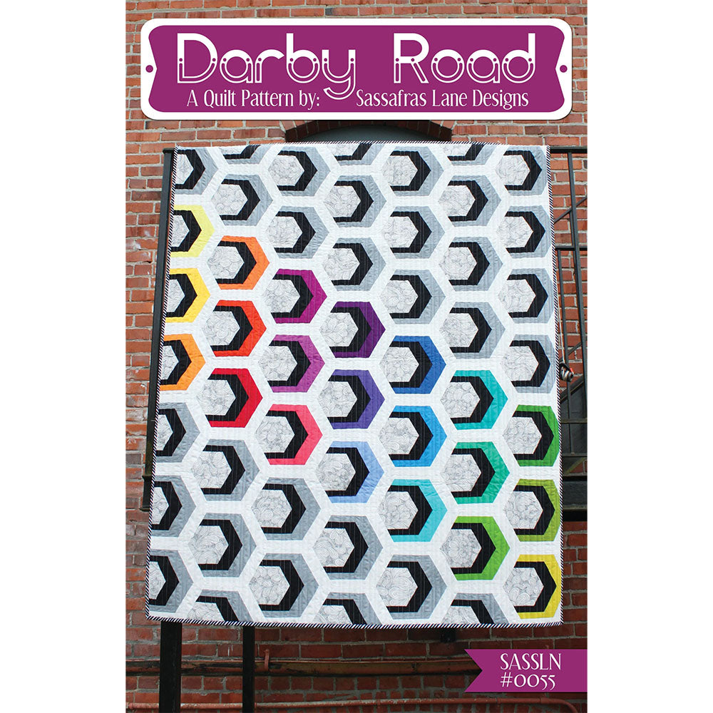 The Darby Road Quilt Pattern by Sassafras Lane Designs is a fun and easy design for beginners passionate about paper-piecing and specific color schemes. This design finishes to three different sizes; 32" by 40", 46" by 56", or 60" by 72". The Darby Road Design by Sassafras Lane Designs also comes with instructions and a list of suggested materials.