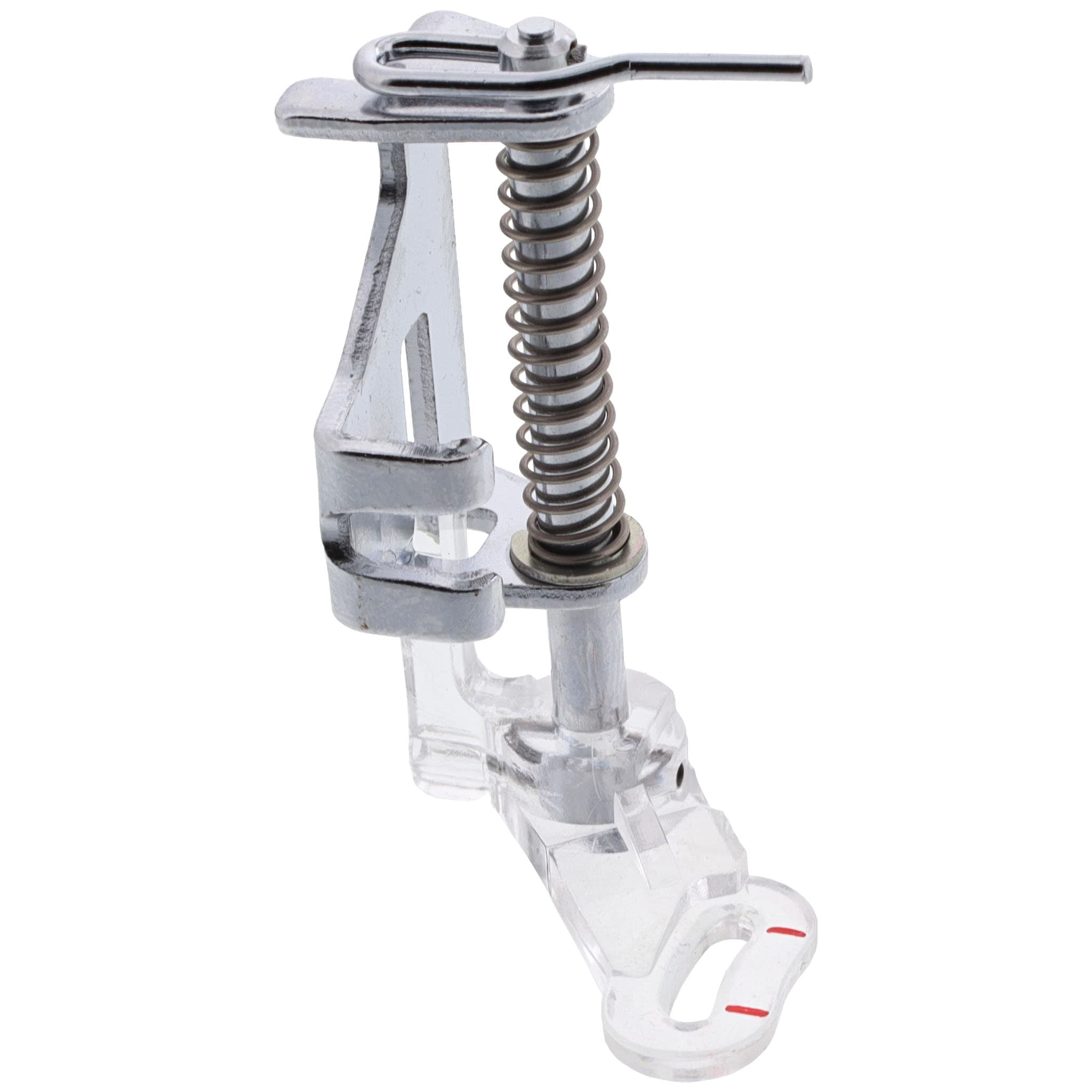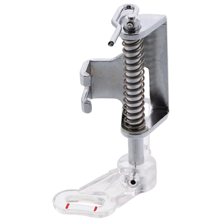 The Darning Foot, also called a free-motion foot, allows you to avoid skipped stitches when free-motion embroidering. It is also helpful for stippling, darning, and monogramming. This foot is spring-loaded and moves up and down along with the needle.