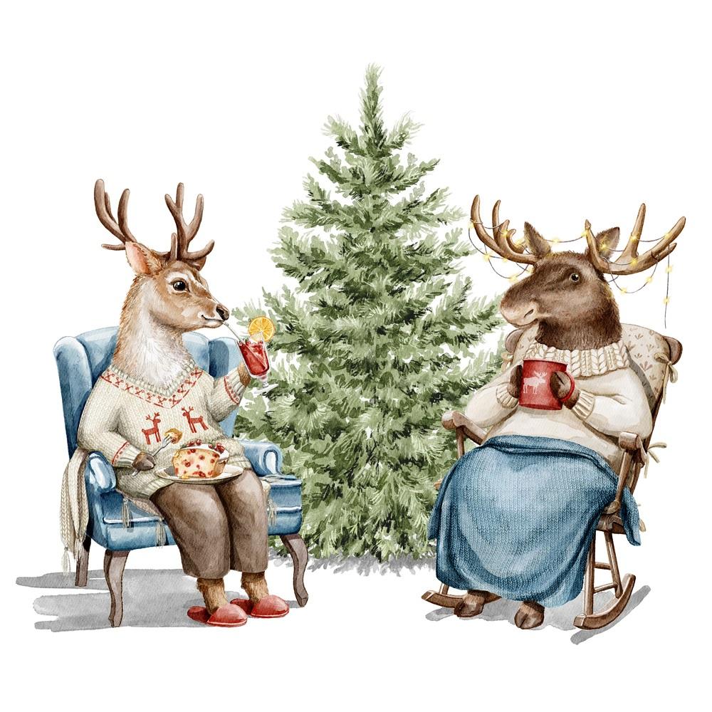 Deer & Moose Sipping Drink By Christmas Tree Fabric Panel Details