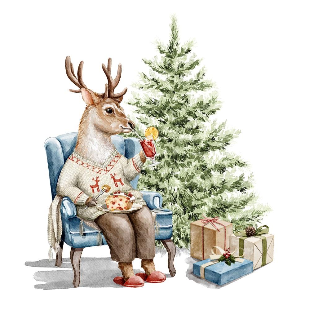 Deer Sipping Drink By Christmas Tree Fabric Panel
