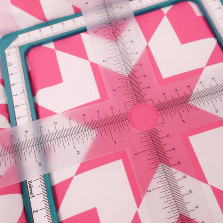 Use the angle finder to establish the exact rotation necessary for any design to be stitched accurately in the hoop. The centering rulers are transparent, flexible rulers designed to fit your hoop to see your markings easily. In contrast, target rulers feature an X-Y axis to locate the center of any area in the hoop quickly. The adhesive rulers can be affixed to hoops, tables, or any surface that requires a ruler, and they can be cut to size. The target stickers are a safe alternative to laying out your project instead of using pens or chalk on your fabric. Lastly, the hoop shields protect your hoop from messy spray adhesives and are available in three sizes!
