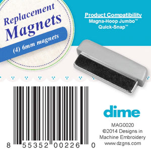 These Replacement Magnets from DIME are strong and durable replacement magnets for Magna-Hoop Jumbo (all versions), Quick-Snap (all versions), Magna-Hoop Pro (all versions), and Universal Magna-Hoop. This set of 4 includes two different sizes: 4mm and 6mm.