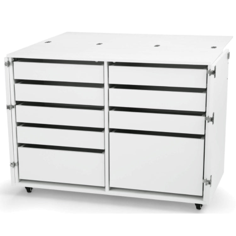 The Dingo II Storage Cabinet & Cutting Table is a must-have for the organized sewing studio of your dreams! Its most prominent feature is the nine spacious, full-view drawers with soft-close technology. It is the perfect height to comfortably cut your fabric, while the industrial locking casters provide sturdiness and mobility. As a bonus, the top of the cabinet unfolds to offer an open work surface. The Dingo II Cutting & Storage Cabinet is an impressive design of tasteful furnishing and multi-functional convenience all in one.