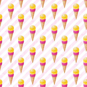 The Double Cones with Sprinkles on Pink Striped Fabric is part of the For The Love Of Ice Cream Collection printed by Sew Creative Fabrics. Digitally Printed on 100% cotton and measures 43-45" wide.