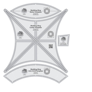 Designed by Judy Niemeyer, this 4 piece rulers set creates perfect double wedding rings. The holes in the template allow you to mark the center of the curved sides, making piecing easy. Equipped with Creative Grid's exclusive grip, this ruler slides easily on fabric yet stays in place when pressure is applied. Use the included instructions or scan the QR code to view a video demonstration. Made in the USA.